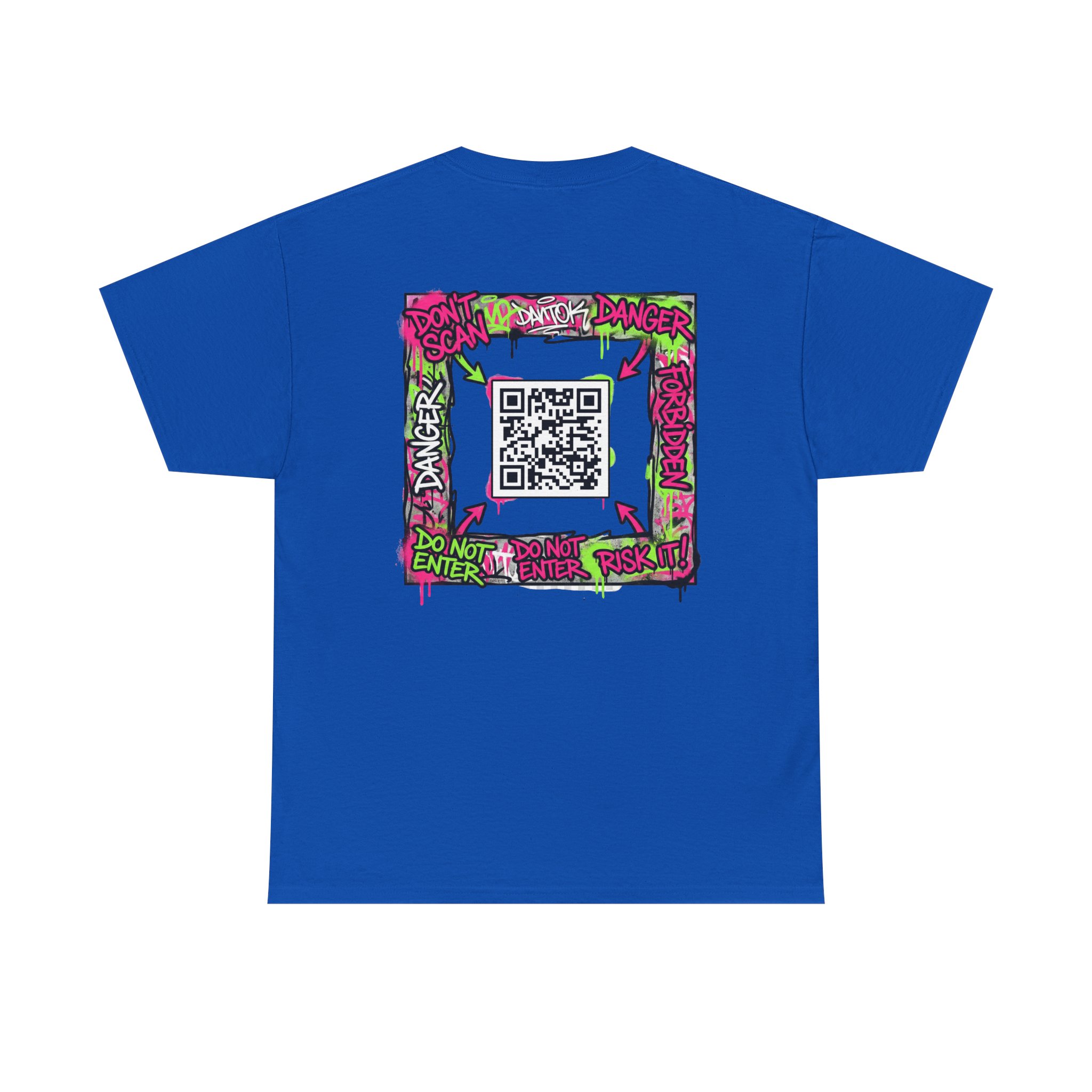 A bold, street-ready tee that wears like a statement. This classic crew shirt holds a vivid, graffiti-inspired graphic across the chest and a framed QR-code design on the back, all rendered in neon greens, pinks and electric accents. The medium-weight, tubular knit keeps the silhouette clean and comfortable, while the ribbed collar and shoulder taping make it hold shape through repeated wear. It sits easily in an urban wardrobe—layer under a denim jacket, wear it with cargo pants, or let it stand alone when you want your look to speak loud. The printed inner neck and crisp sleeve details add that polished, finished feel for people who care about both craft and edge.