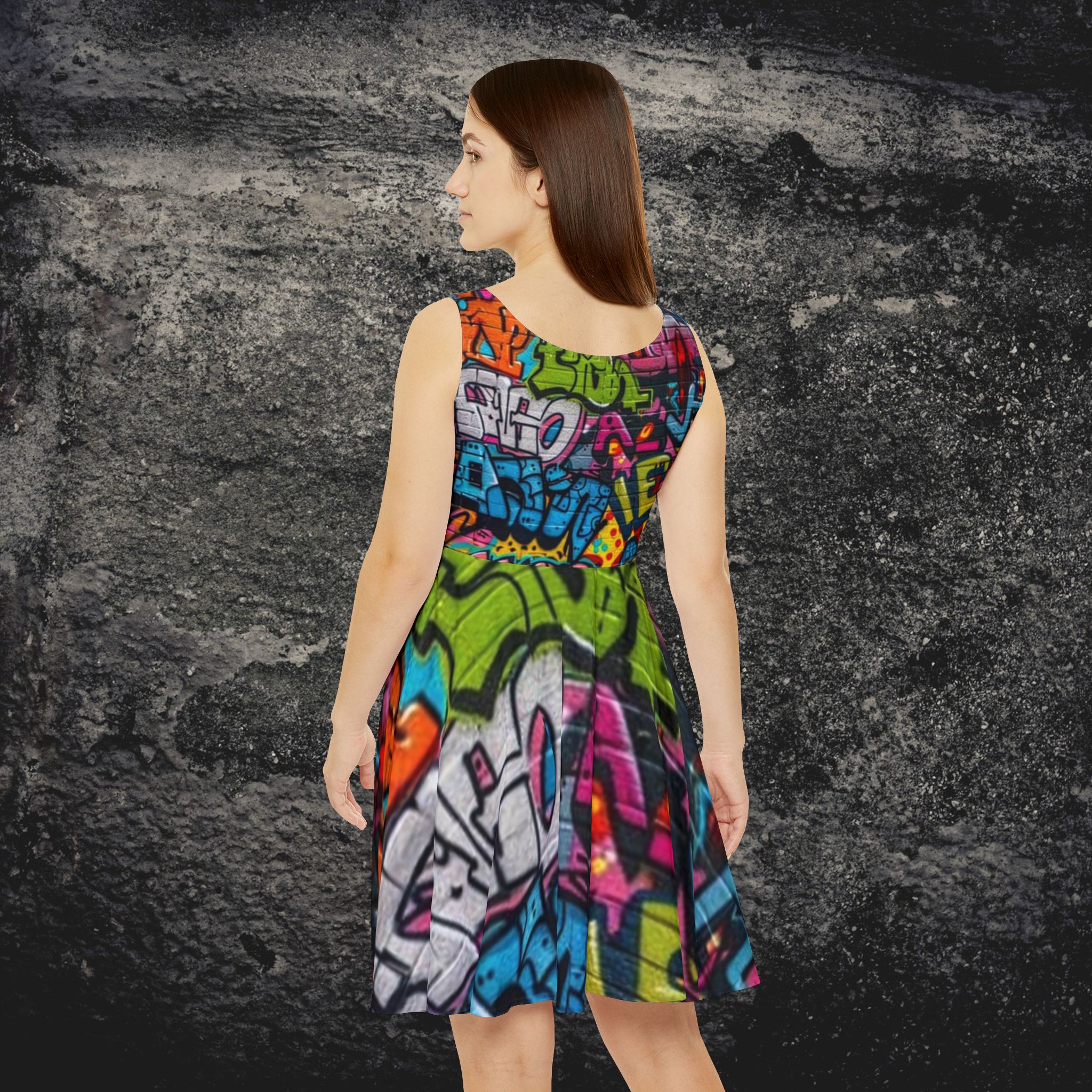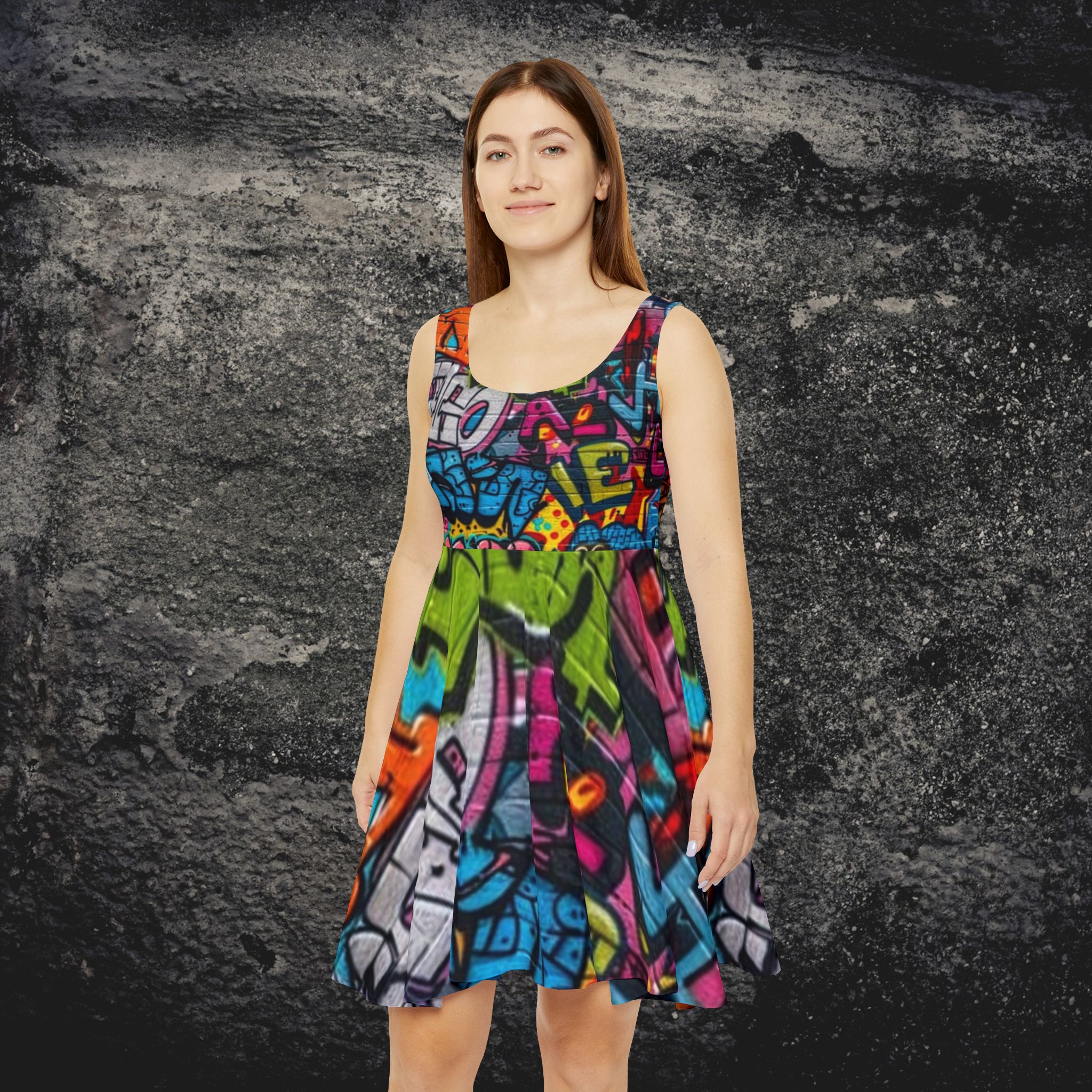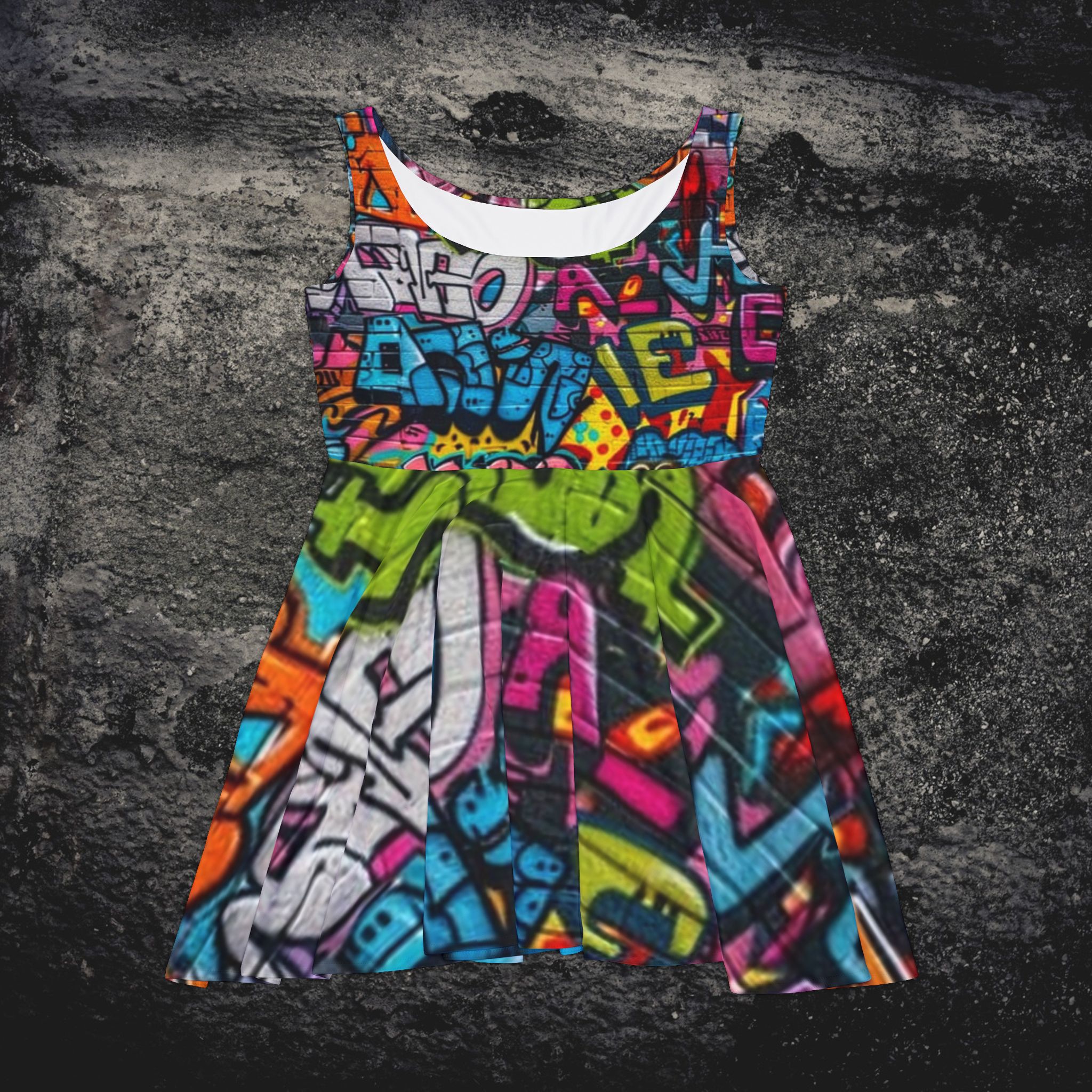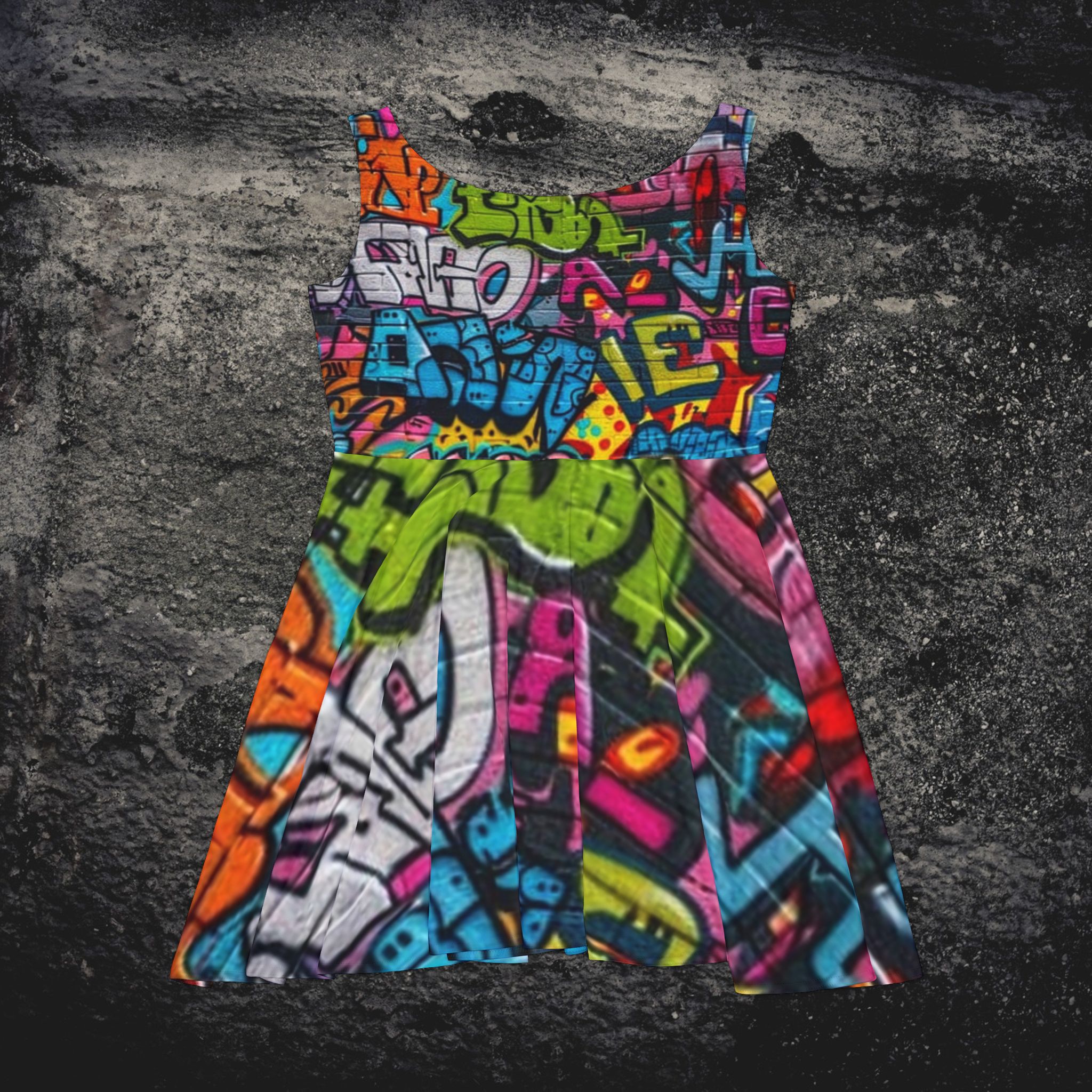 This mid-length skater dress channels urban energy with a bold all-over graffiti print that pops in vivid, saturated color. The sculpted, high-cut scoop neckline and fitted bodice lead into a flared, asymmetrical skirt that moves with you—fresh, playful, and unapologetic. Breathable stretch fabric (polyester/spandex) keeps the silhouette smooth and comfortable, while reinforced double-needle stitching adds structure for repeated wear. Wear it to a street art crawl, a rooftop show, or whenever you want color and confidence to do the talking.
